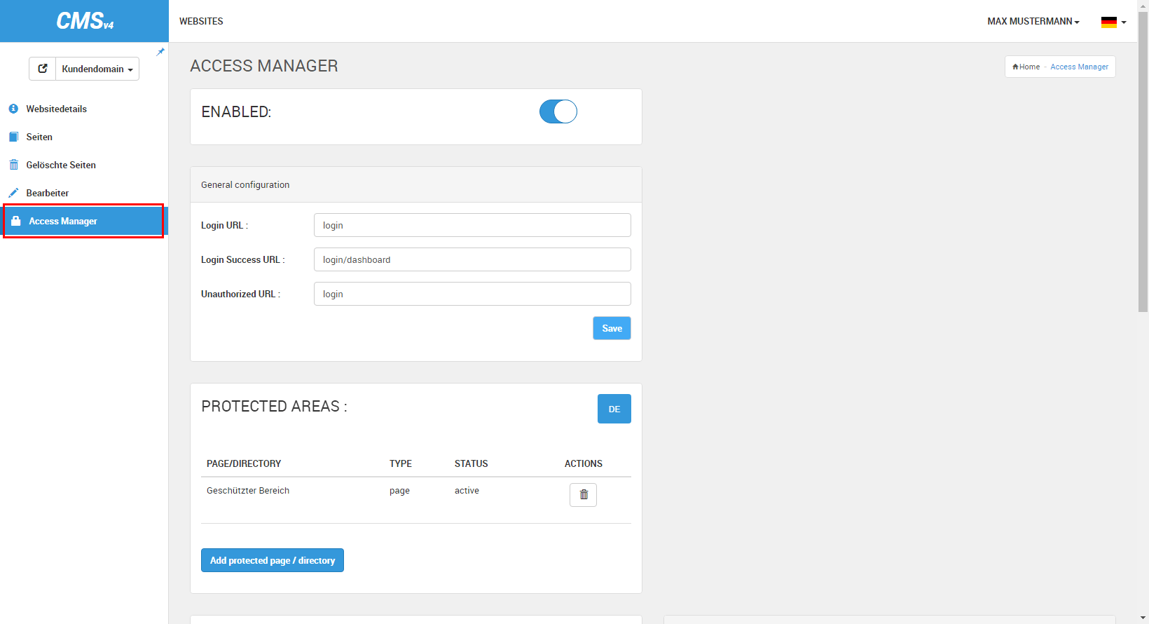• Wechseln Sie zum Menüpunkt »Access Manager« und fügen Sie die neu erstellte Seite dem Verzeichnis »Protected Areas« über den Button »Add protected page / directory« hinzu. Dies stellt sicher, dass die Seite nur für berechtigte Benutzer sichtbar ist.