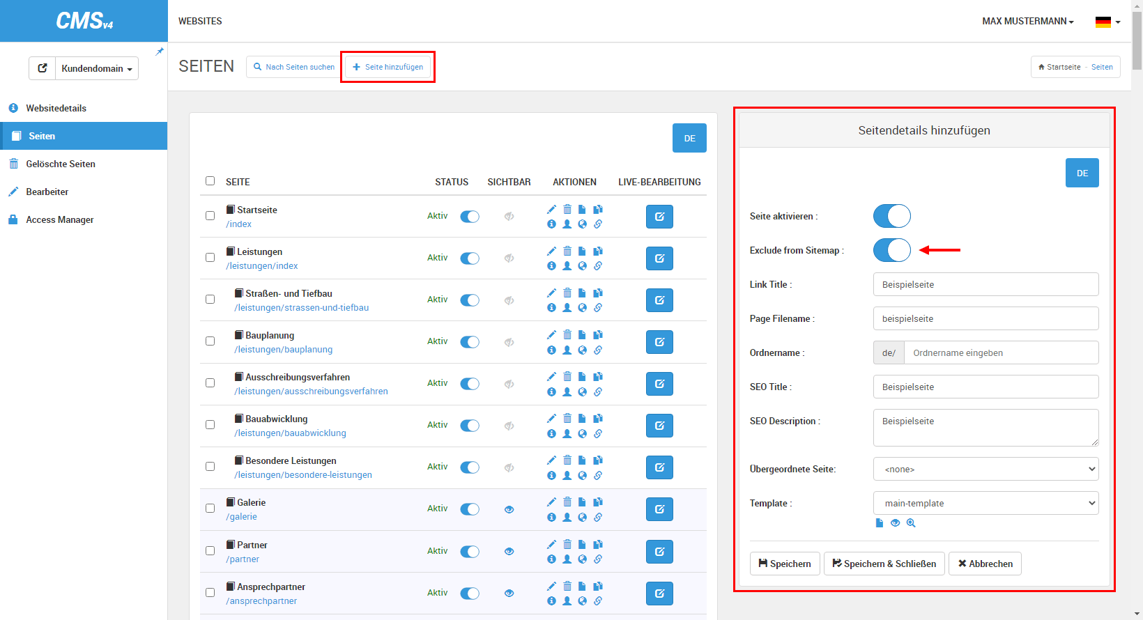• Klicken Sie auf den Button »Seite hinzufügen« neben der Überschrift.