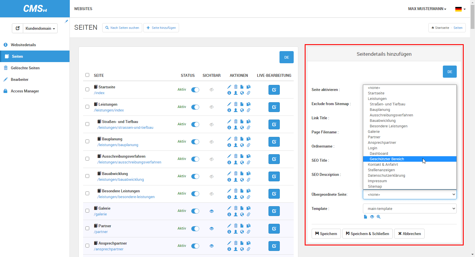 • Wählen Sie bei »Übergeordnete Seite« die Seite aus, unter der die neue Seite als direkte Unterseite im geschützten Bereich angelegt werden soll.